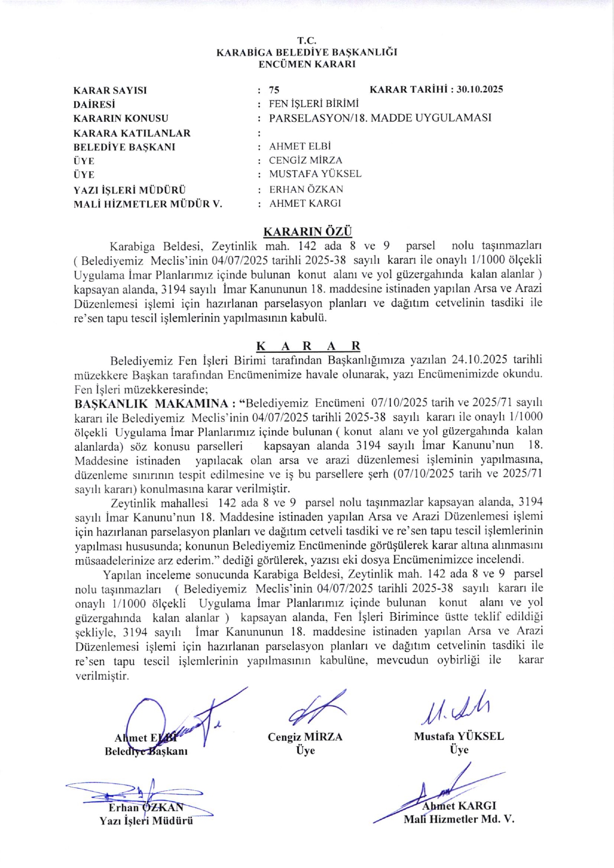 Belediyemiz Encümeninin 14.02.2023 tarih ve 2023-12 sayılı kararı ile Beldemiz Zeytinlik mahallesi 142 ada 11,12,13,14,15,16 nolu parseller 105 ada 10 parsel,142 ada 37 parsel nolu taşınmazın imar planı içinde konut lejantı alanında kalan kısmını kapsayan alanda,