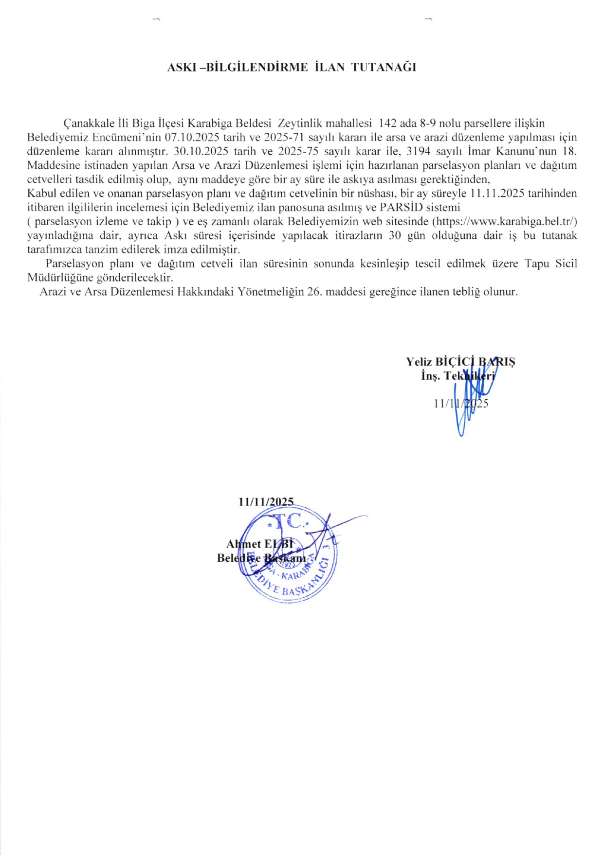 Karabiga Belediyesi, askı bilgilendirme ilan tutanağı